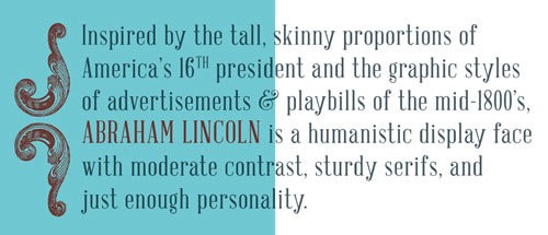- Description: Inspired by the proportions of the 16th U.S. President and 1800s advertisements, this font offers moderate contrast and sturdy serifs.