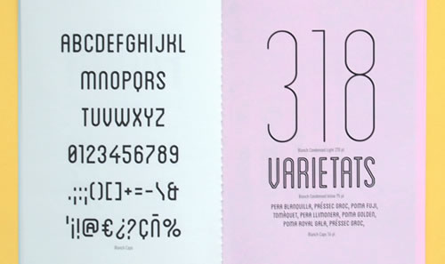 - Description: Designed for the “Fruita Blanch” brand, Blanch is a traditional font with a contemporary feel. It includes six weights—three condensed and three caps—allowing for versatility in design.